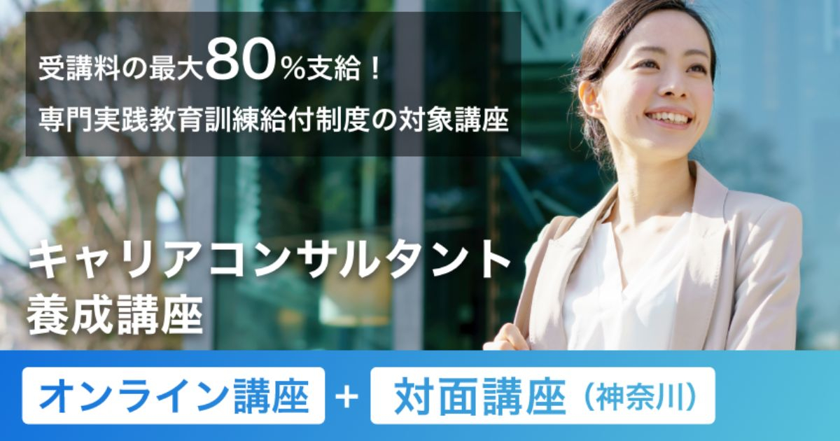 【初心者・未経験者】大歓迎。仕事や育児と両立しながら国家資格キャリアコンサルタントの取得を目指せる養成講座です。オンライン中心の少人数制で、対面講座(横浜・藤沢)も実施。専門実践教育訓練給付金対象で、最大80%の支給が可能です。令和8年4月開講クラスは定員制のため、定員になり次第締切となります。