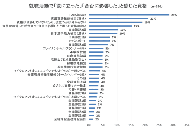 語学以外では「ITパスポート」12%、「日商簿記2級」8%、「日商簿記3級」7%、「MOS一般レベル」7%が続きました。