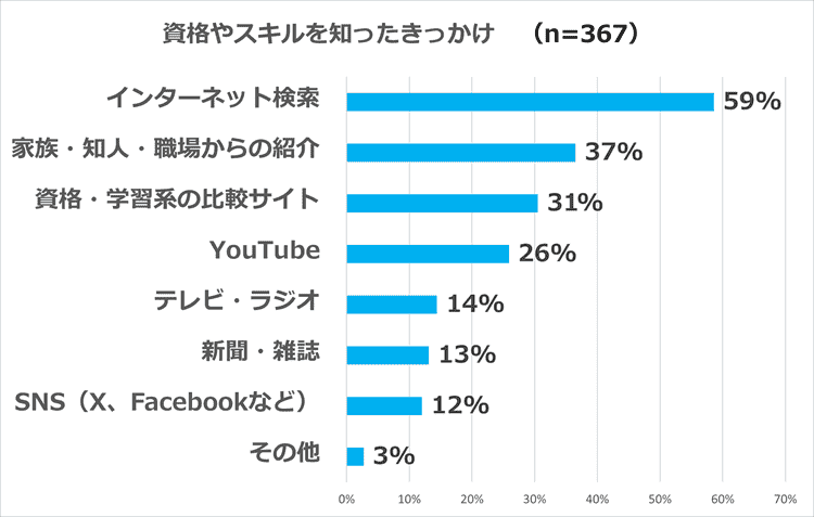 資格やスキルを知った情報源やきっかけは、「インターネット検索」59%、「家族・知人・職場からの紹介」37%、「資格・学習系の比較サイト」31%、「YouTube」26%と続きました。