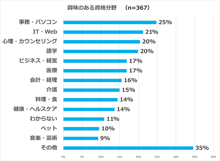 最も多かったのは「事務・パソコン」25%、次いで「IT・Web」21%、「心理・カウンセリング」「語学」が各20%でした。