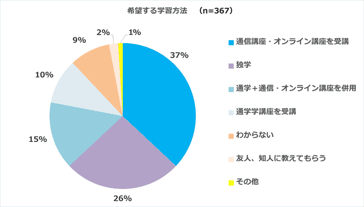 最も多かった回答は「通信講座・オンライン講座を受講」で全体の37%でした。