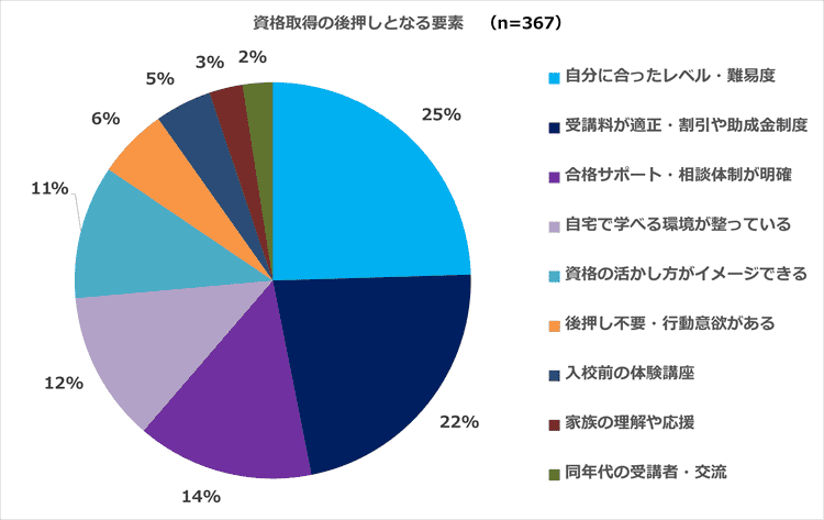 後押しとなる要素の上位には、「自分に合ったレベル・難易度」25%、「受講料が適正・割引や助成金制度」22%、「合格サポート・相談体制が明確」14%、「自宅で学べる環境が整っている」12%が挙げられました。