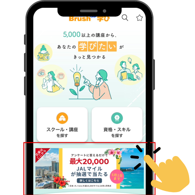 「最大20,000JALマイルが当たる」と記載されたバナーをタップ